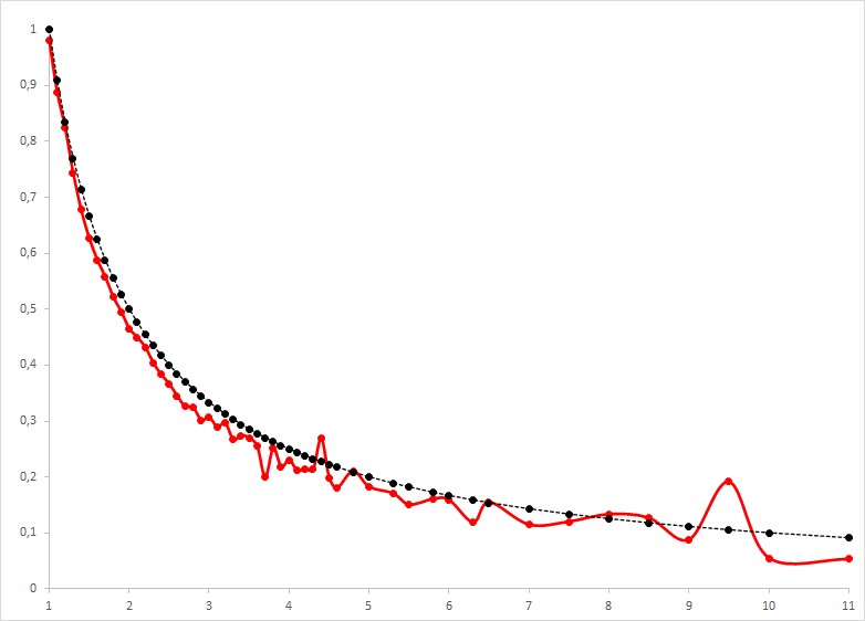 In the above figure I compare the actual observed win frequencies (fat line in red) with the implicit probabilities (dashed line in black) for all odds between 1 and 11 (on the x-axis). Isn’t it remarkable how close these two curves are? Look, for instance, at these two points: Of the 3138 games with betting odds of 1.2 with implied break-even probability of about 83%, the observed winning frequency is 82.3%. Of the 11045 games with betting odds of 2.2 and implied break-even probability of 45.5%, the observed win frequency is 43.2%. Note that the two curves come from entirely different data. The implicit probabilities are derived from the betting odds, which in turn, as I explained above, are derived exclusively from the betting behavior in the betting market. The observed win frequencies are derived from counting how often teams win their football games. Two entirely different things. And yet, they match almost perfectly. One could say that the implicit probabilities derived from the betting odds are really well calibrated: they are great estimates of the actual winning probabilities of, in this case, the home teams in football games.